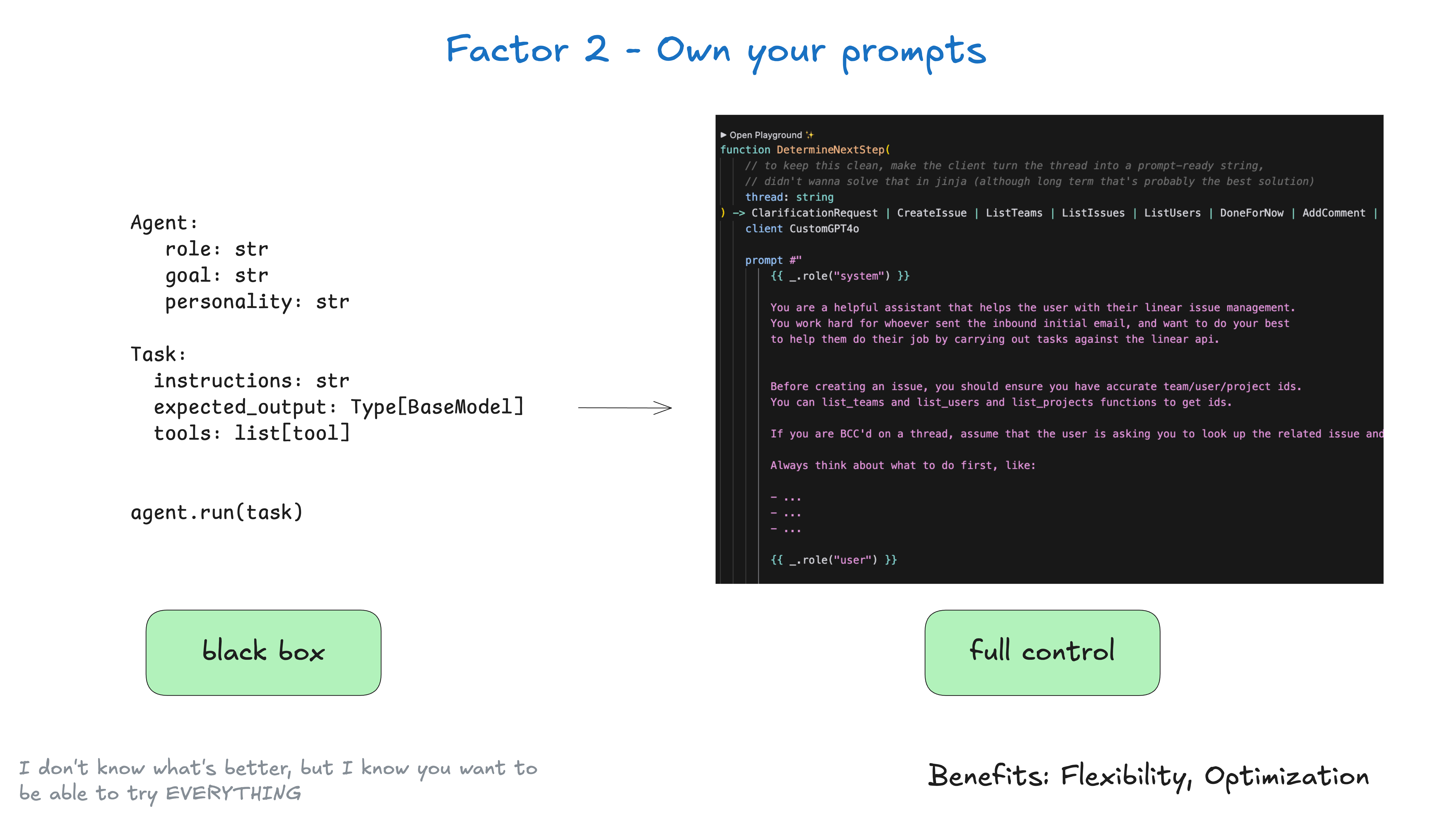 解析: 框架的黑箱式 Prompt 抽象是优化的噩梦。开发者必须能够完全控制发送给模型的每一个 token,包括系统指令、少量示例(few-shot examples)、动态数据和输出格式要求。只有这样,才能进行精细的性能调优和行为修正。