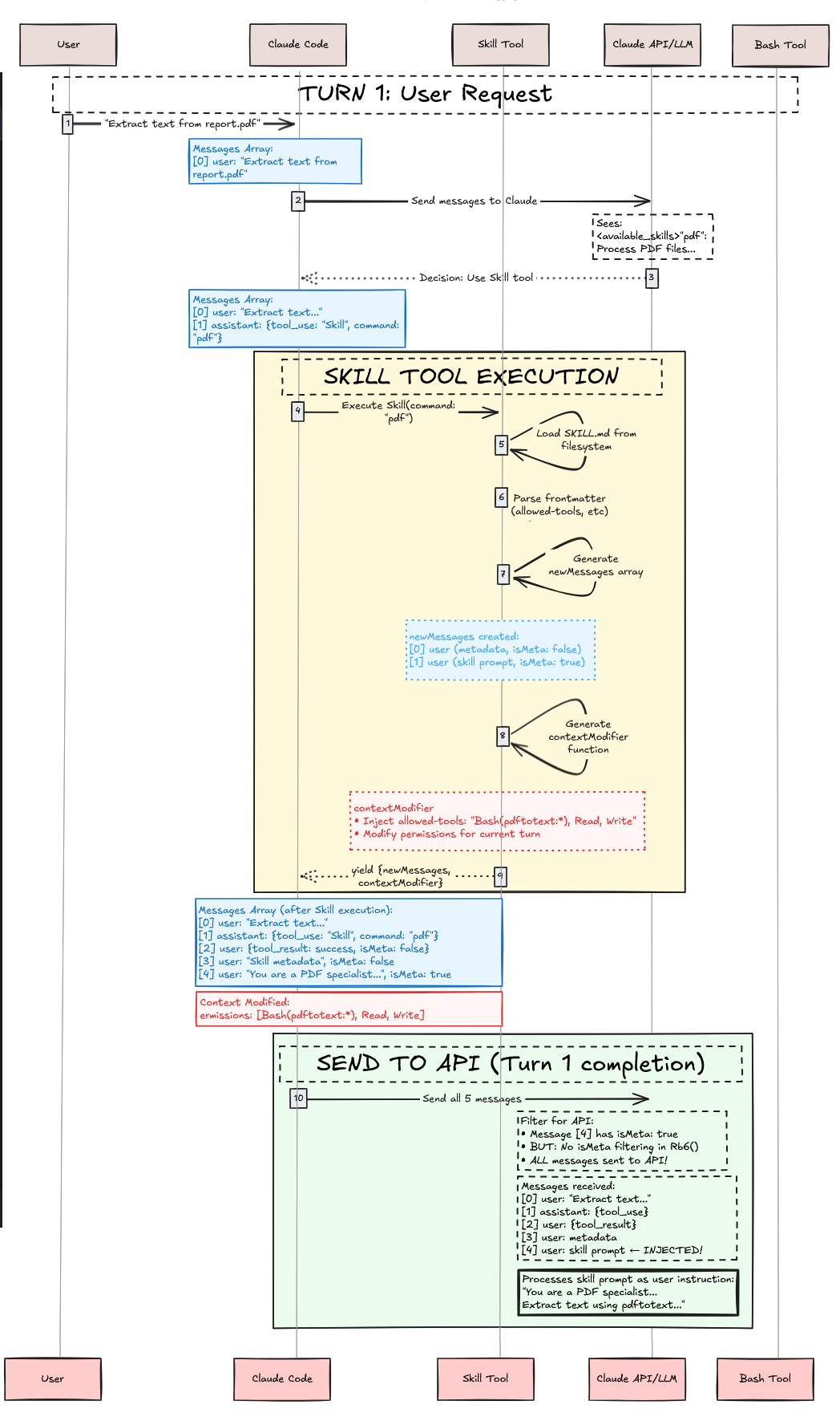 Skill 工具产生其结果,包含 newMessages(元数据 + 技能提示词 + 用于对话上下文注入的权限)和 contextModifier(用于执行上下文修改的工具权限 + 模型覆盖)。这完成了序列图中黄色的“SKILL TOOL EXECUTION”框。
