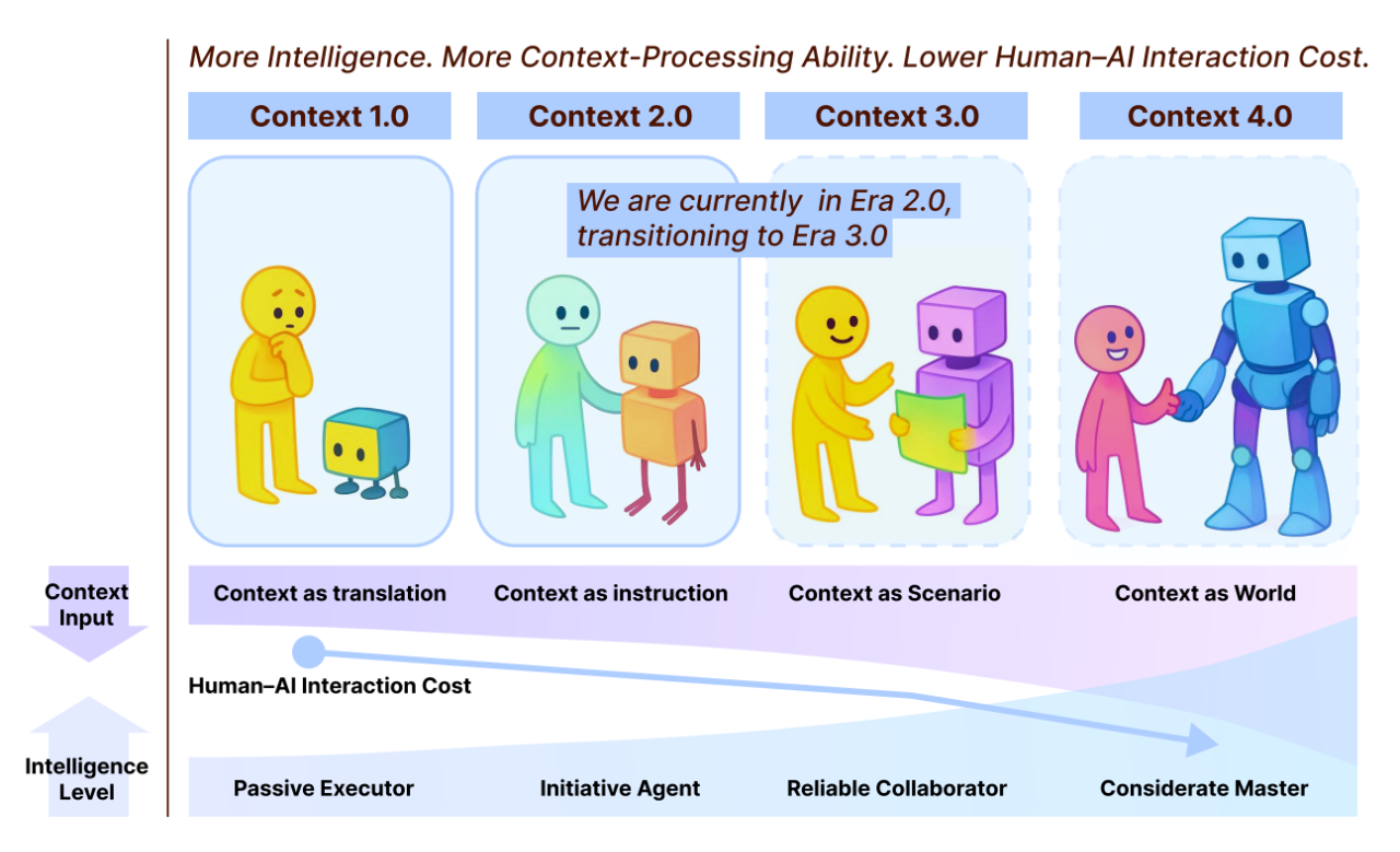 论文将上下文工程的核心使命定义为熵减:人类意图是高熵的,机器需要低熵的表示。因此,上下文工程的“努力”在于将高熵的人类意图转化为机器可理解的低熵表示。这种努力的成本是衡量人机交互效率的关键,并随着机器智能的提升而逐渐从人向机器转移,构成了论文四阶段模型(Era 1.0 到 Era 4.0)演进的根本逻辑。