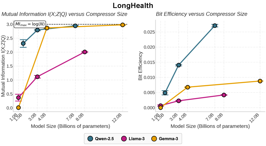 - 精简度红利 (Conciseness):在 LongHealth 数据集上,Qwen-2.5 7B 模型生成的摘要长度显著短于 1.5B 模型。更大的模型能更精准地抓住重点,抛弃冗余信息,其生成的 Token 数量最高可减少 4.6倍。
