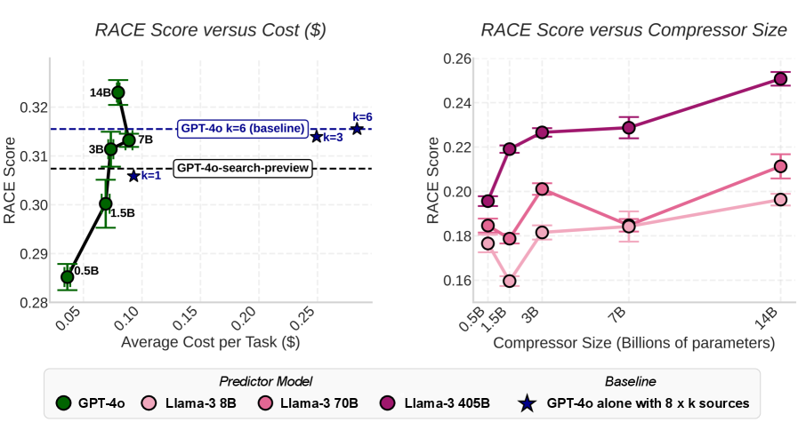 - 使用 14B 的 Qwen-2.5 作为本地压缩器时,最终报告的 RACE 评分比基准 高出 2.3%。