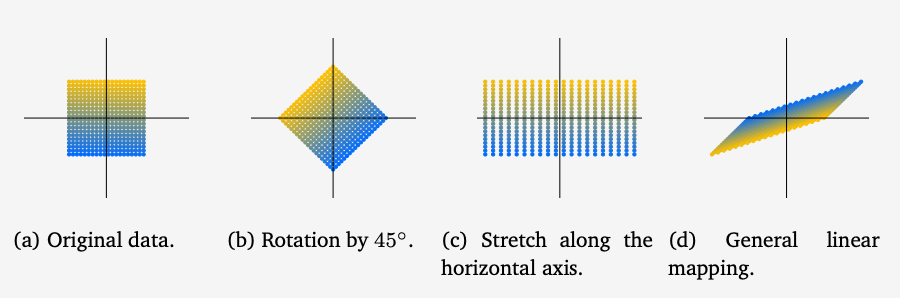 核心思想:任何一个从 \(n \) 维向量空间 \(V \) 到 \(m \) 维向量空间 \(W \) 的线性映射 \(\Phi\),都可以用一个 \(m \times n \) 的变换矩阵 (transformation matrix) \(\boldsymbol{A}_{\Phi} \) 来唯一表示。