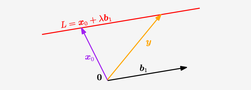 直线 (Line): \(\mathbb{R}^n\) 中的一维仿射子空间。由一个支撑点 \(\boldsymbol{x}_0\) 和一个非零方向向量 \(\boldsymbol{b}_1\) 定义。